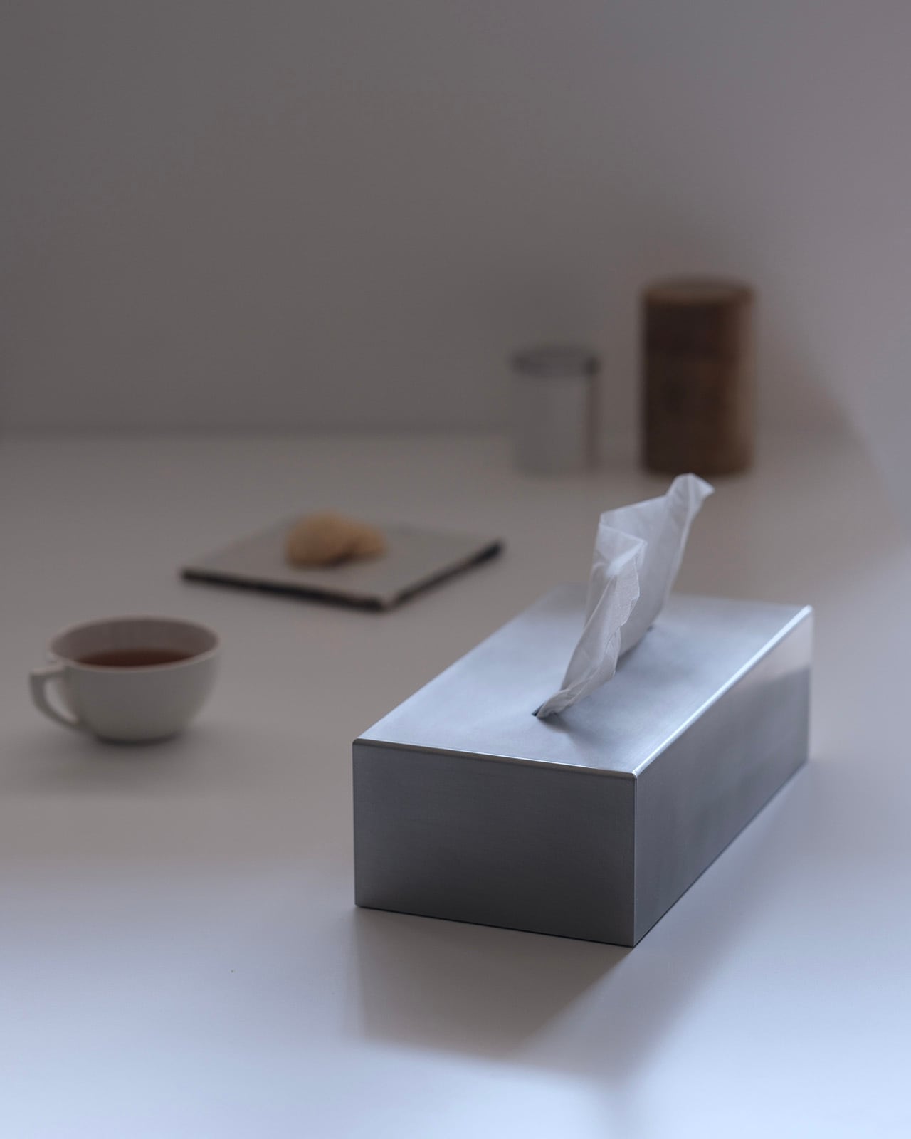 アルミニウムの板を曲げ加工してティッシュケースを作りました。こちらはボックスティッシュ用で、身と蓋に分かれた箱状のシンプルな構造です。ミニマルなデザインのこのケースはティッシュに付き物だった生活感を感じさせず、これまで置き場所に困っていたティッシュが、どこにでも置きたくなるような存在に生まれ変わります。手に取ると程良い重さがあり頑丈さが伝わってきます。四隅は溶接をすること無く、熟練した職人の技術を活かした精密板金と呼ばれる曲げ加工のみで精度の高い形状を作っているため、よりすっきりとした構造美が感じられます。表面はランダムに細かなキズをつけたサンディング仕上げで、1つずつ手作業で丁寧に行っています。手作業によって生まれた味わい深い自然なムラは、ギラギラとした光沢ではなく優しく落ち着きのある光沢で、ティッシュペーパーの白さや柔らかさとの一体感が感じられる美しい質感になりました。日用品であるティッシュケースにふさわしい少し控えめな上品さと凜とした佇まいが魅力です。仕上げには指紋をつきにくくする耐指紋コーティング処理をしてありますので、汚れを気にすることなくお使い頂けます。(素地の美しさを損なわない自然な見た目のコーティングです。)